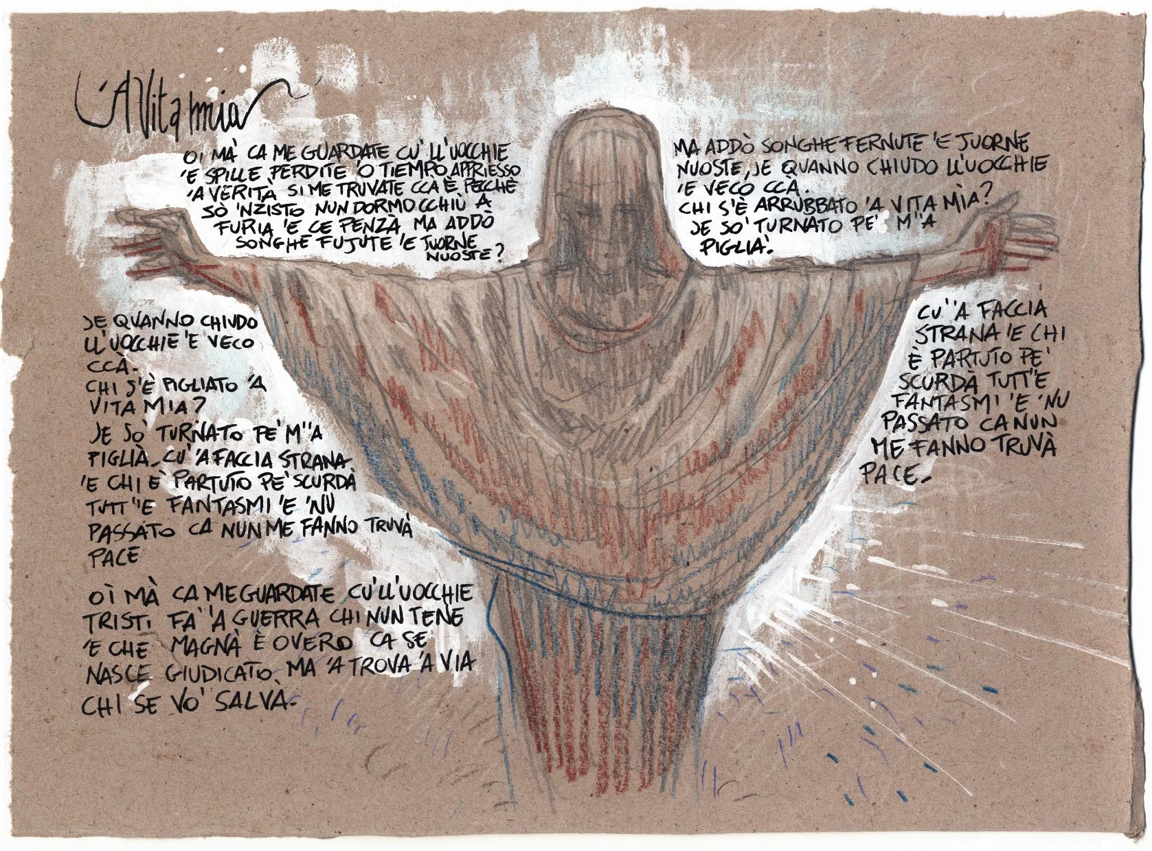 Disegno originale di Dario Sansone con testo canzone tratta dal disco "Santo Sud" e pubblicato nel volume "Santo Sud a poetry sketchbook". Fa parte della mostra "Santo Sud The Exhibition" presso Fondazione Rodolfo Viola.